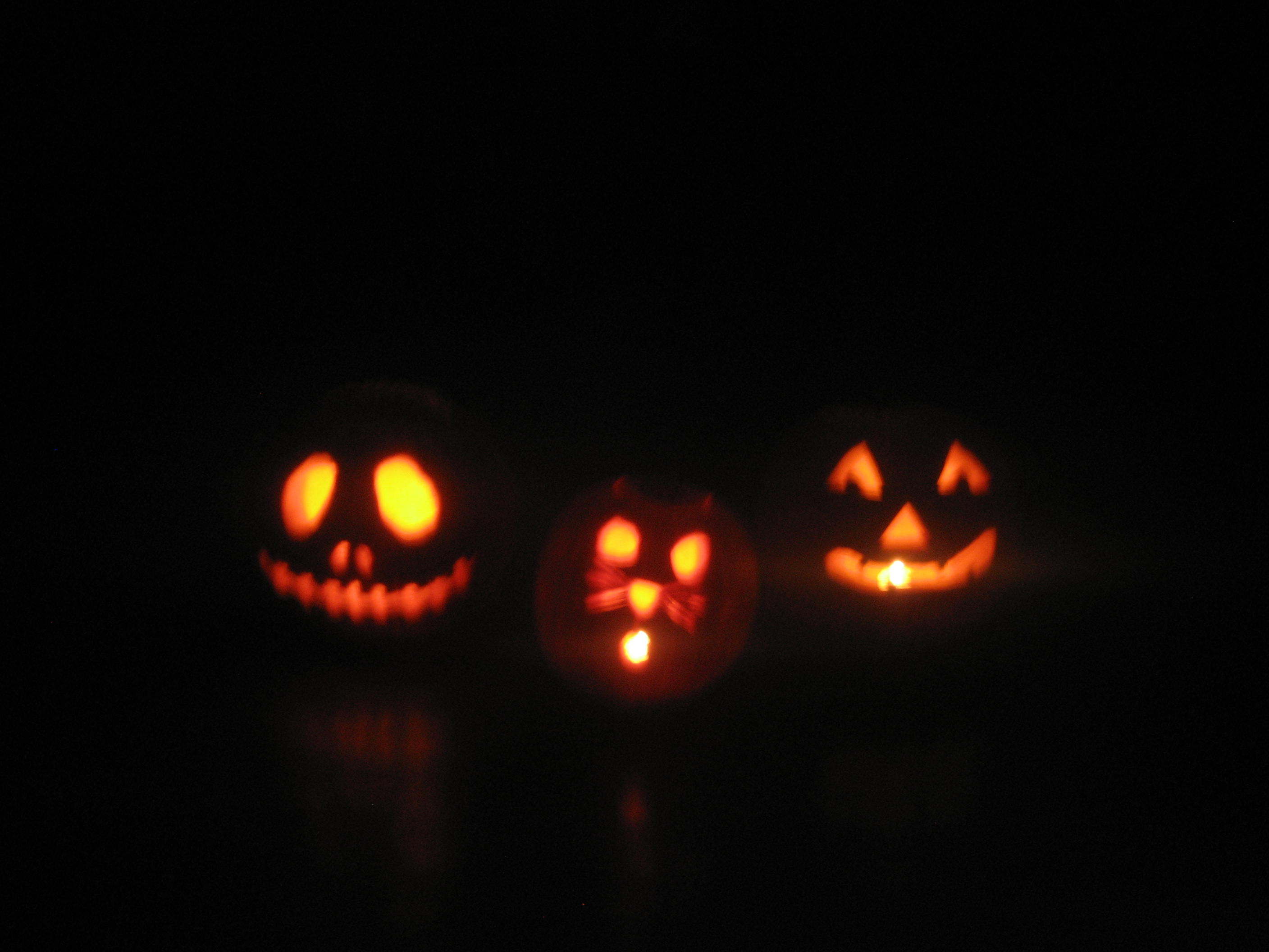 The jack-o-lanterns above were carved by Sarah, Dusty and Cheyenne. Cheyenne’s is the cat in the middle. It is good to see she has higher level skills than her mom. I am still on the pumpkin carving 101 level (yep – triangles). Me, a big knife and an excuse to slice into something…no, no, no…bad idea. All I can be trusted to do today is to wish you all a lovely and safe Halloween. 🙂