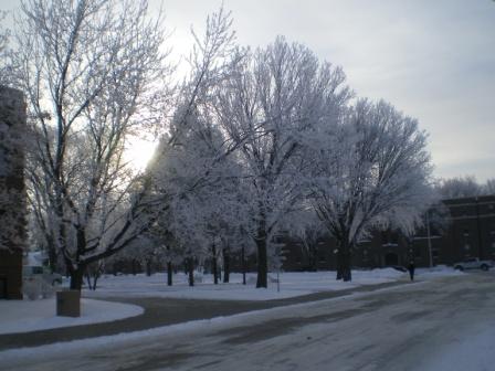 I took a few photos on my way to work. The tree with the sun behind it is in my neighbor’s yard. The trees on both sides of the street are the trees that line the street with the little square houses (I took the photos through my windshield). The final photo was taken on NDSU’s campus.