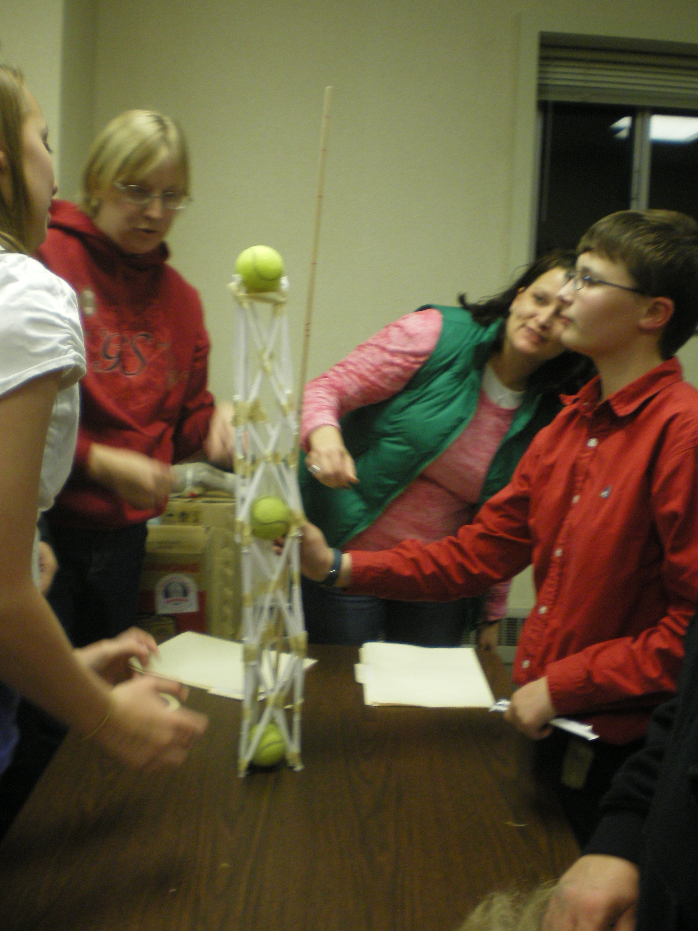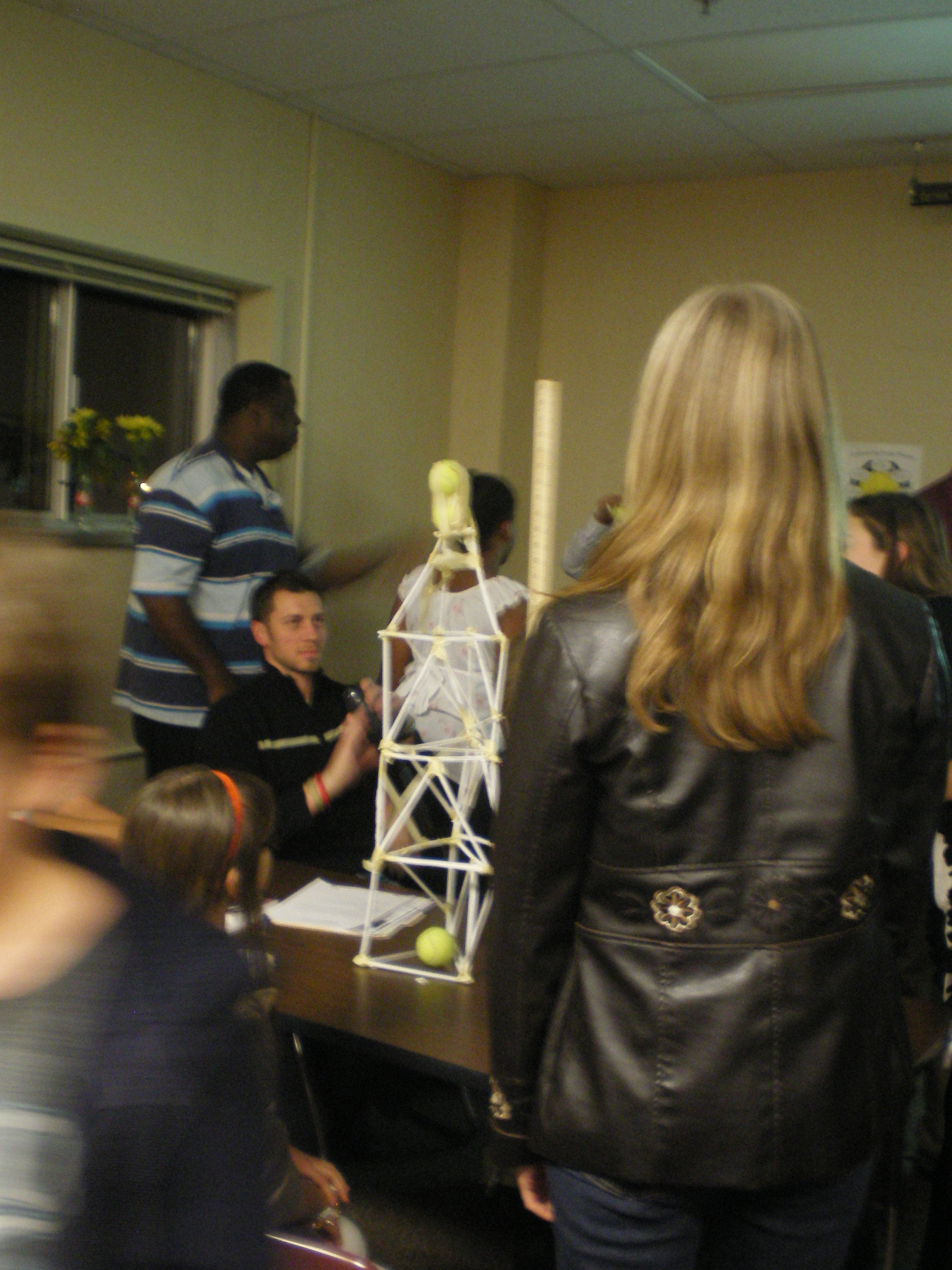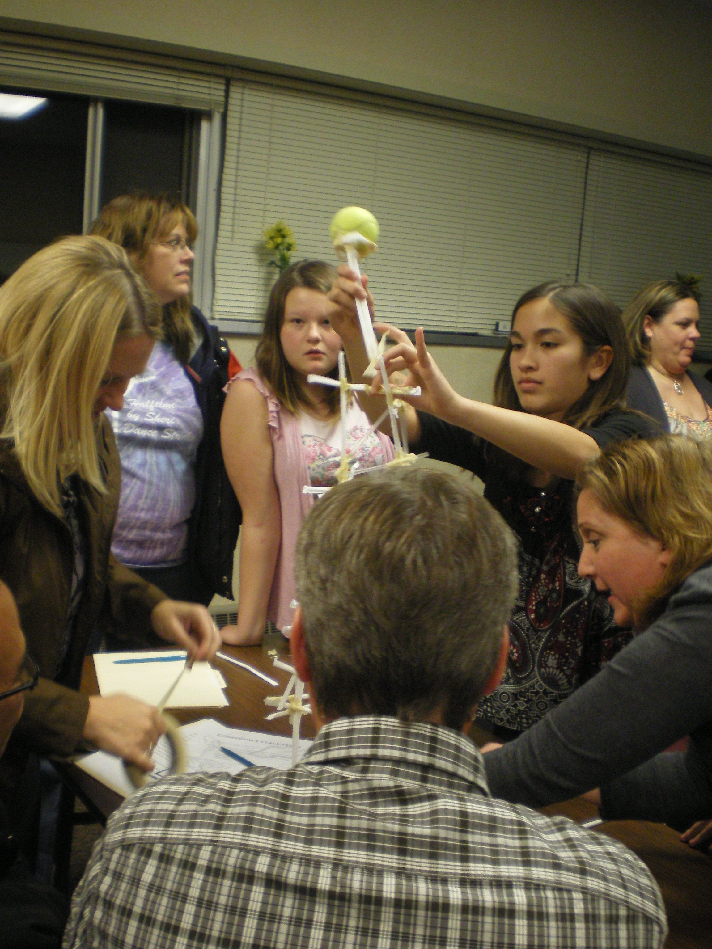 One of the activities focused on team building and the value in fostering creativity, collaboration, communication and critical thinking in problem solving. That resulted in tables of parents and kids trying to build the tallest structure they could in 10 minutes. It was great to see how engaged the parents were with the kids on this activity. It was difficult for the 7th grade teaching team to reel them back in after that activity to talk about what lessons were learned in the process (they were all a-buzz amongst themselves about the experience, evaluating their structure and sharing afterthoughts for future designs). I guess that was the whole point. 😉
