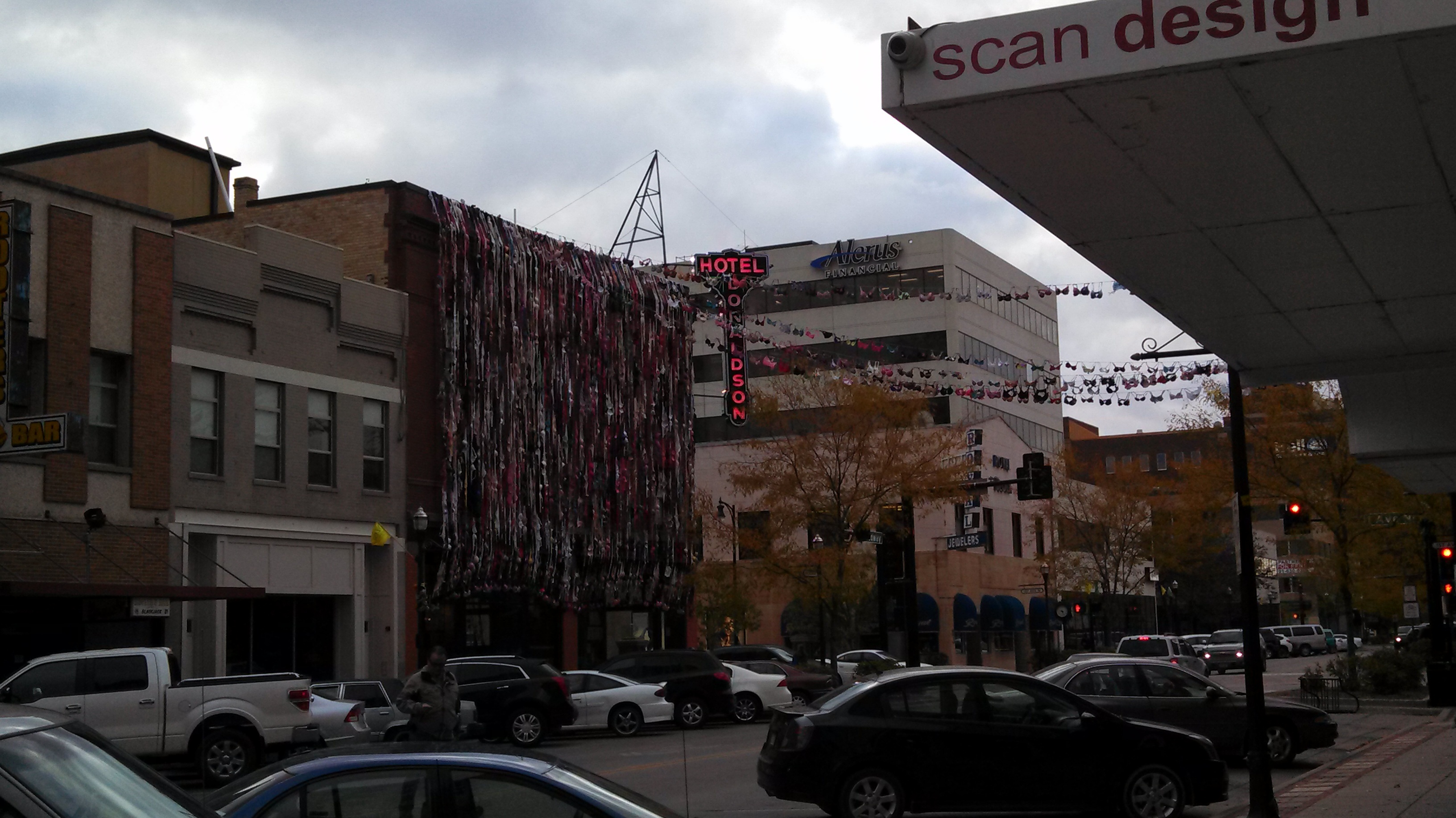 On my way back down Broadway from the clinic I came upon the annual Bras on Broadway display. Bras on Broadway supports women fighting breast cancer in our area.  The display this year not only blankets the HoDo, it also is strung across Broadway.  It sends an impressive message of solidarity.