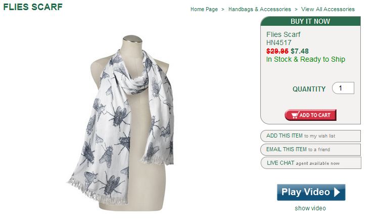 The scarf has already been marked down from $29.95 to $7.48. Apparently a scarf covered in giant flies is not the sought after item the buyers thought it might be. Who knew?