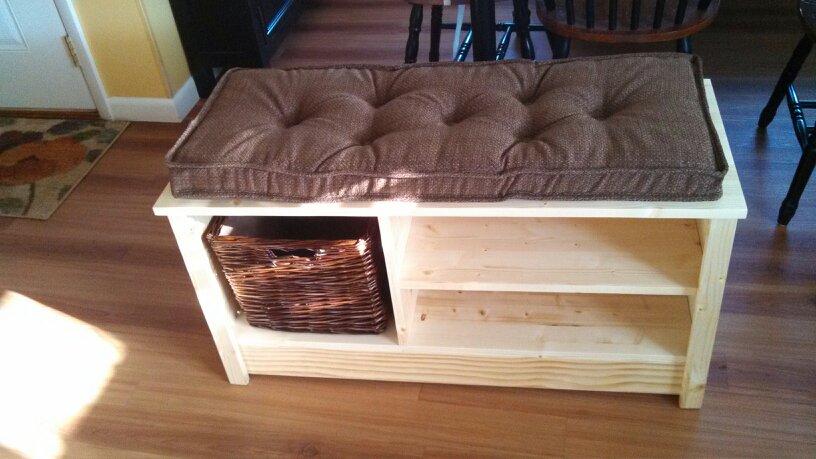 For Niloufar’s birthday, Mike made her a bench that she can put in the entryway and sit on to put her shoes on. Mike made it with the same type of clean wood look and finish he made Cory’s table with – simple lines and a basic Danish oil finish. It turned out nice – sturdy and functional. I gave Mike my design ideas as translated through Cory and he did the real work. Mike has gotten really good at creating my design ideas. I did do the cushion and the basket selection – that was the extent of my engagement on the project.
